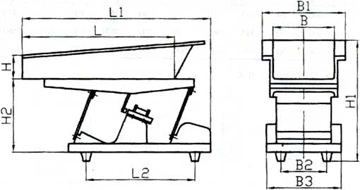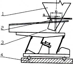 電磁振動(dòng)給料機(jī)的振幅和給料量受料倉(cāng)倉(cāng)壓影響較大,設(shè)計(jì)料倉(cāng)時(shí)應(yīng)盡量減少倉(cāng)壓,使溜咀后側(cè)板承受一定的倉(cāng)壓,并設(shè)置斜溜沮及下料閘門(mén)。如圖,一般a=1/4b。溜咀四周應(yīng)與給料槽留有一定的間隙,一般5~10mm,以免產(chǎn)生噪音及影響振動(dòng)。